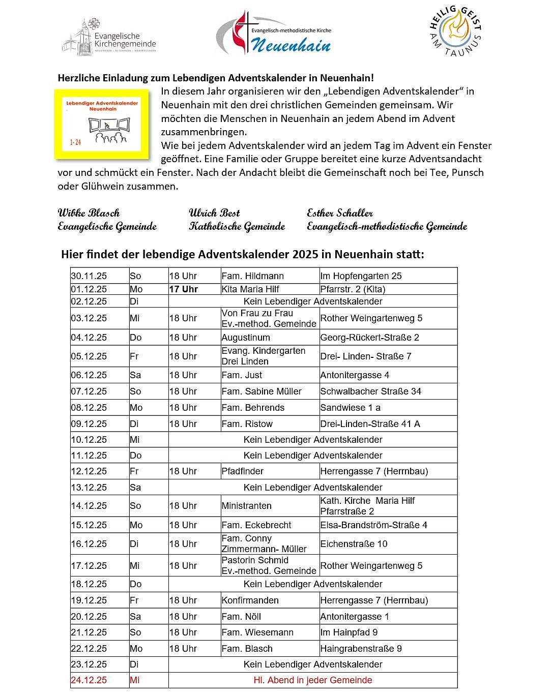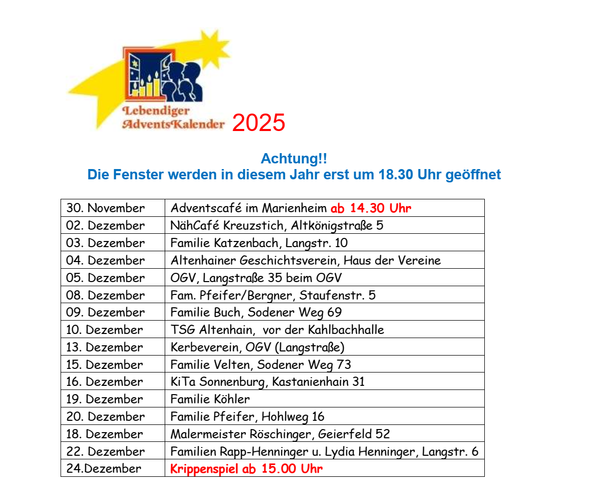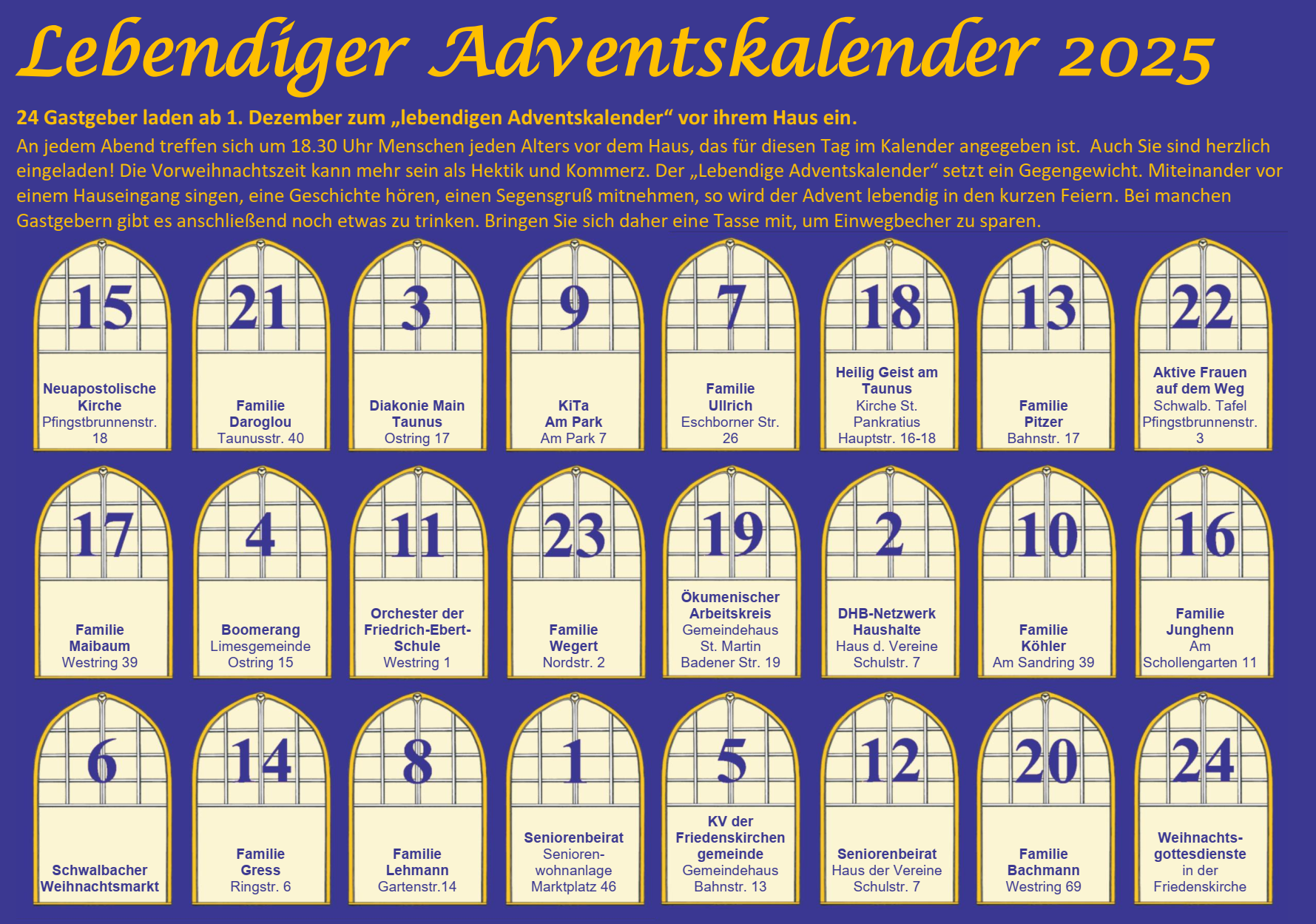 Der „Lebendige Adventskalender“ besteht aus 24 Adventsfenstern, die in Sulzbach verteilt sind (siehe Anhang)