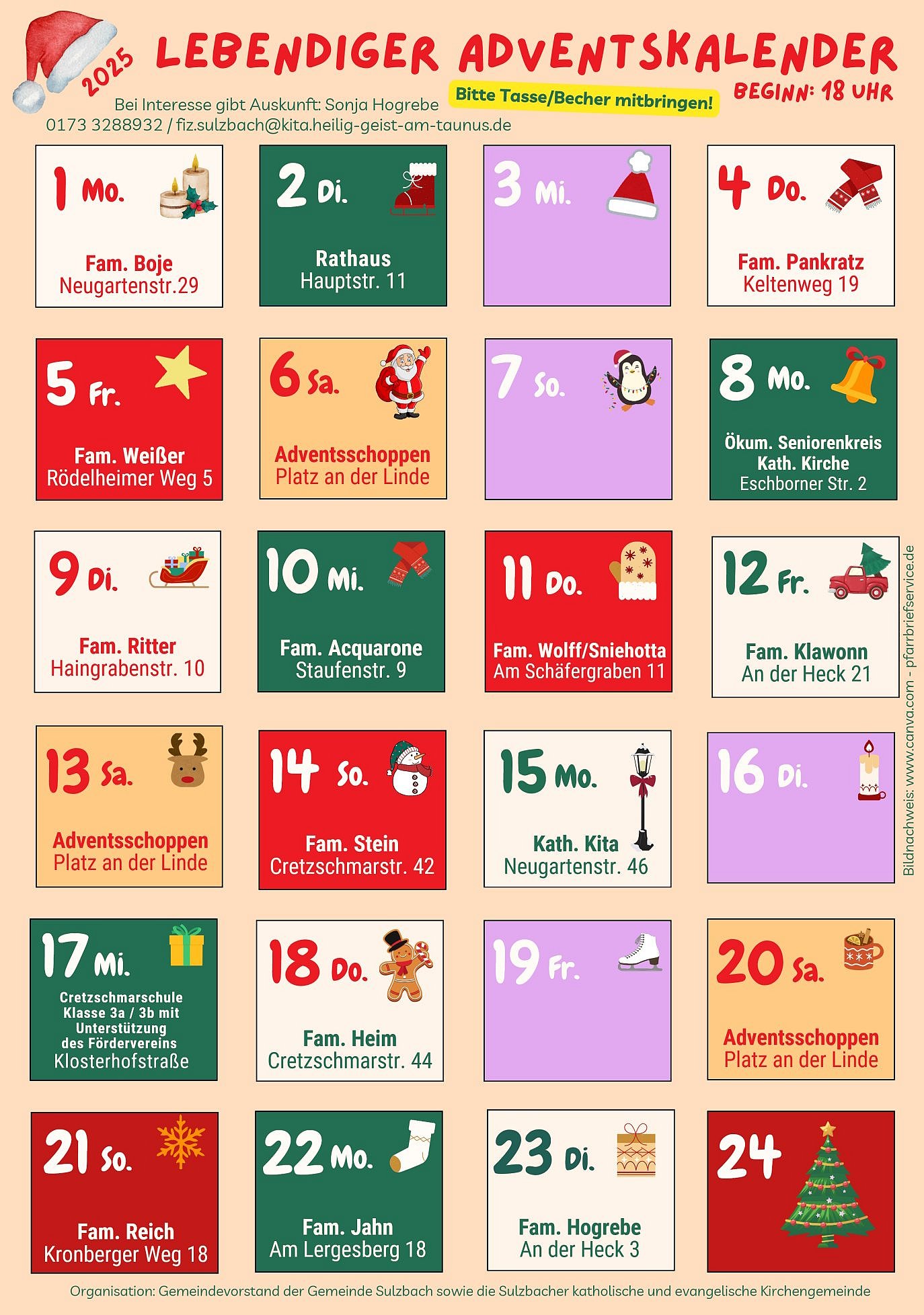 Vom 01.12. – bis 23.12. wird es in Sulzbach wieder den „Lebendigen Adventskalender“ geben.