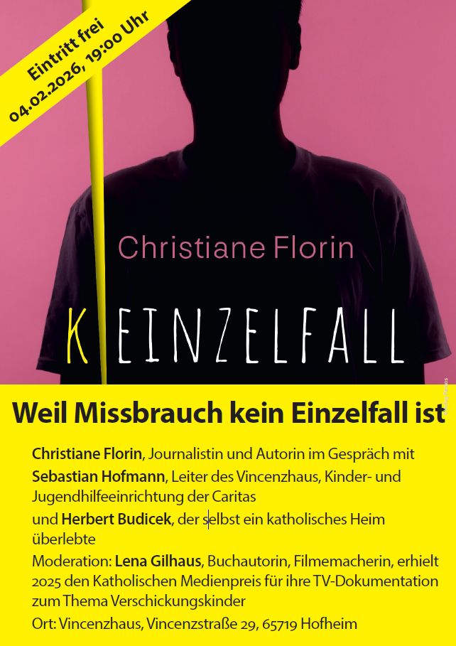 Am Mittwoch 4. Februar um 19.00 Uhr wird Frau Dr. Christiane Florin, Autorin des Buches „Keinzelfall“ zu einer Podiumsdiskussion ins Vincenzhaus kommen und gemeinsam mit Herrn Hofmann, Einrichtungsleitung der Kinder- und Jugendhilfe im Vincenzhaus, über Heimkinderziehung, Aufarbeitung und Entschädigungsversuchen und vor allem über die lebenslangen Folgen für Betroffene diskutieren. Herr Budicek, Mitglied im Betroffenenbeirat Fulda – Limburg und Überlebender der Heimkinderziehung, wird mitdiskutieren und seine Perspektive einbringen. Die Journalistin Lena Gilhaus wird diese Veranstaltung moderieren.