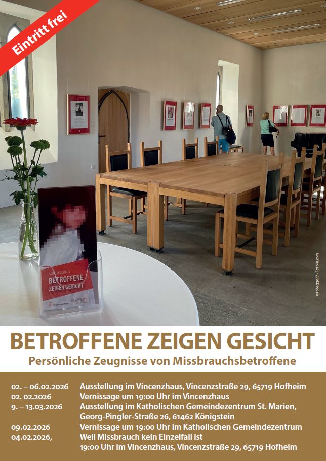 Es findet jeweils am Montag um 19.00 Uhr eine Vernissage statt: am 2.2. in Hofheim und am 9.2. in Königstein. Frau Claudia Schmidt vom Betroffenenbeirat Fulda – Limburg wird bei den Vernisasges anwesend sein. Sie ist eines der Gesichter in der Ausstellung.